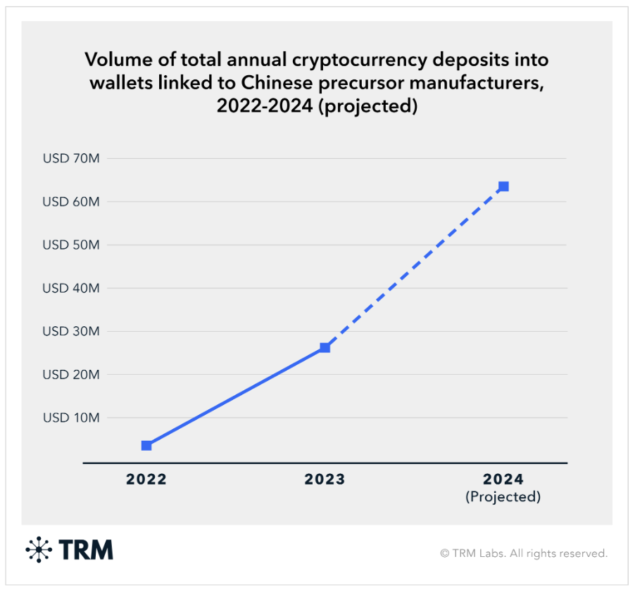 Wallets linked to Chinese precursor manufacturers received more than USD 26 million in cryptocurrency during 2023 alone.